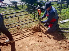 На каждом из четырёх углов вкручиваем сваи. Грунт на данной могиле попался твёрдый, после того, как сваи уже не вкручиваются, начинаем их забивать. Окончательно загнать сваи в землю так и не удалось, поэтому срезаем выступающие части. На качестве каркаса данное решение никак не отобразилось, так как длинна наших свай всегда несколько больше, чем требуется.